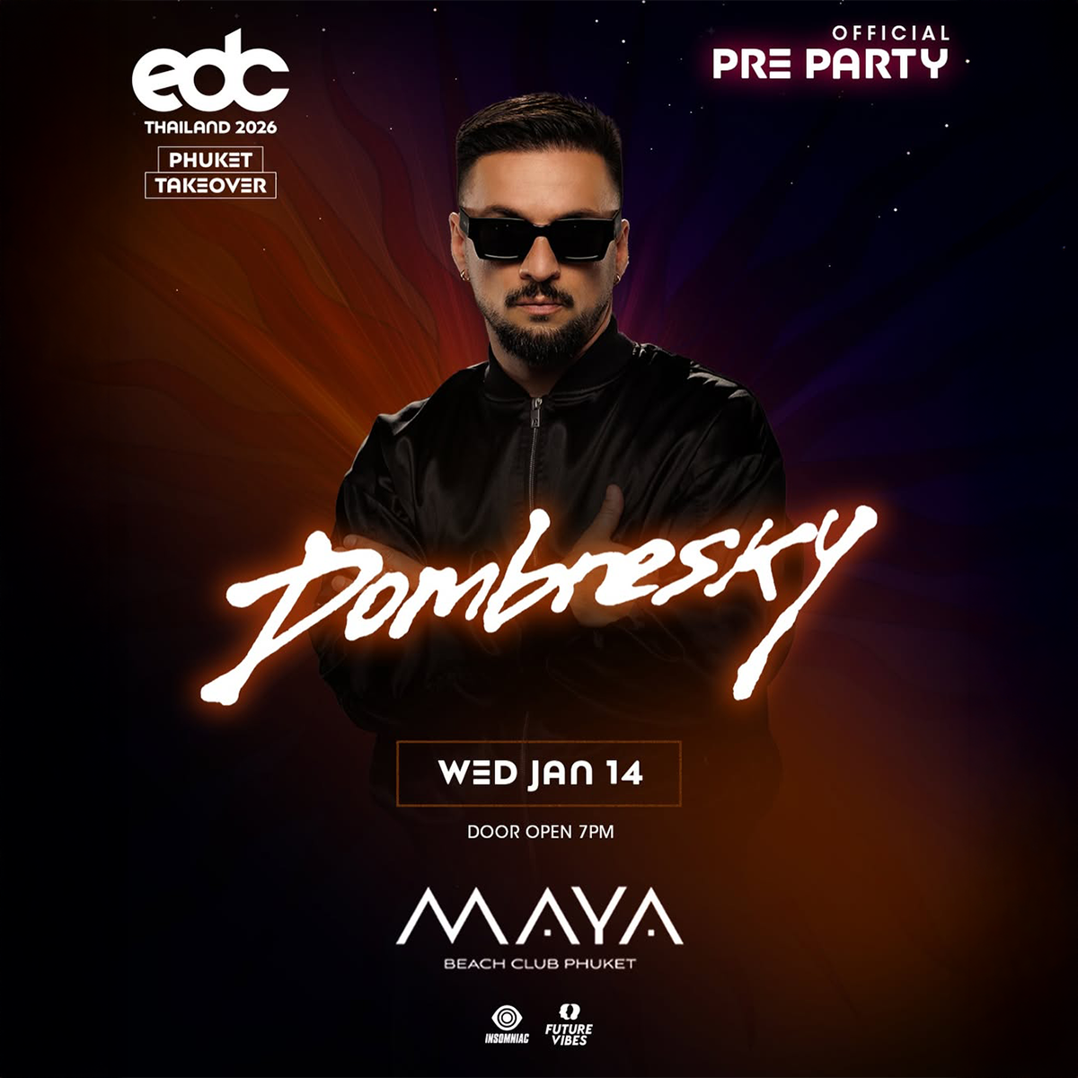January 15th, 2026 This event is the official pre party for EDC Thailand 2026 and takes place at Maya Beach Club Phuket on Wednesday 14th January 2026 with Dombresky.
