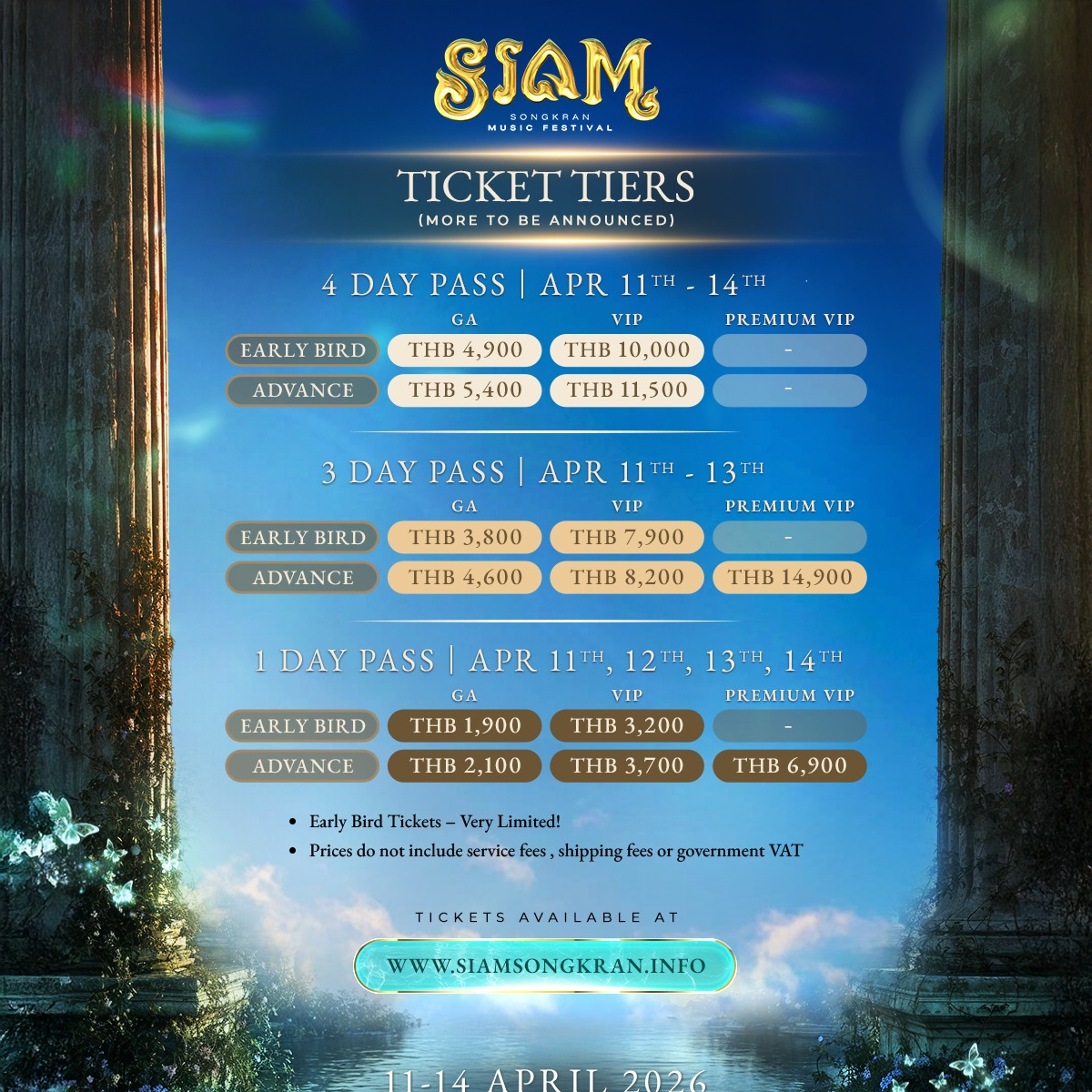 Advance ticket pricing includes 4 day passes at 5,400 THB for GA and 11,500 THB for VIP, 3 day passes at 4,600 THB for GA, 8,200 THB for VIP, and 14,900 THB for Premium VIP, and single day tickets at 2,100 THB for GA, 3,700 THB for VIP, and 6,900 THB for Premium VIP.